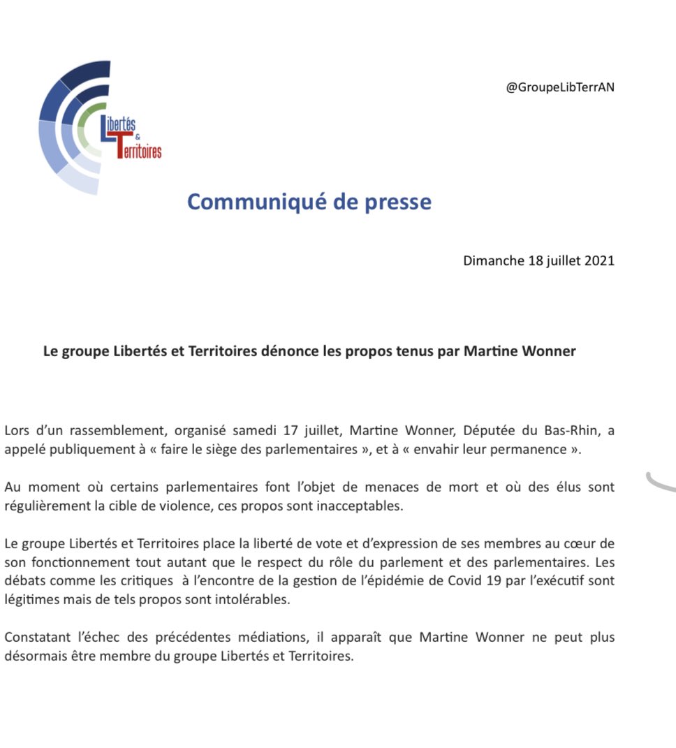 The day after the words of mp martine wonner, calling on the demonstrators against the health pass to take the seat of parliamentarians and invade their offices, members of the parliamentary group freedoms and territories asked, this sunday, his.